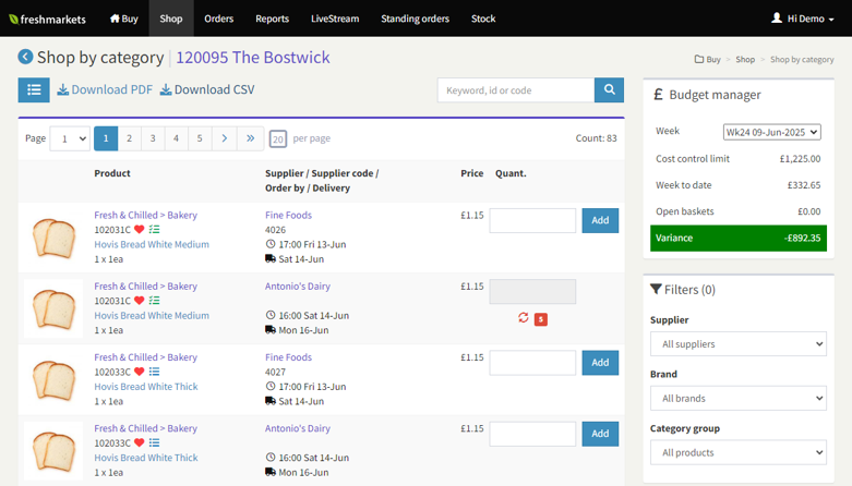 Freshmarkets taps into EF-group’s robust supplier network and Foodbuy Group’s £2.5bn buying power – covering food, cleaning, medical, and non-food categories. You can integrate preferred or legacy suppliers and access stock tracking and visibility features to pre-empt potential shortages or delays.